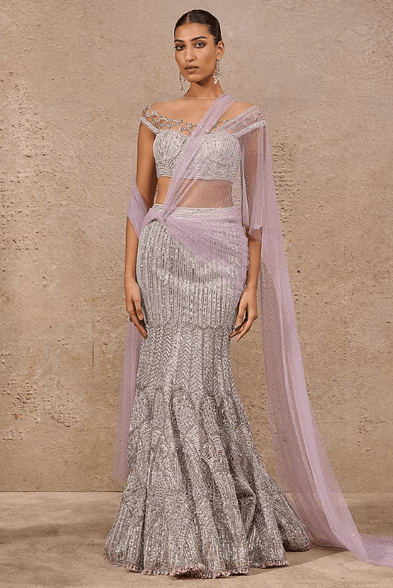 a silver fish-tail skirt in tulle base with sequins hand embroidery. It is paired with a corset and a crystal drape. Accentuate it with statement jewellery and heels for a wedding, sangeet or engagement ceremony.
