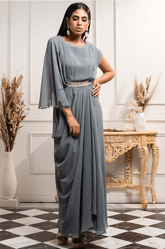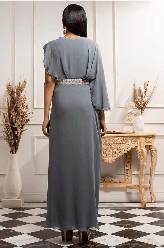 Featuring a blue cowl draped dress in georgette base with crystals, glass beads, and pearls hand embroidery.
