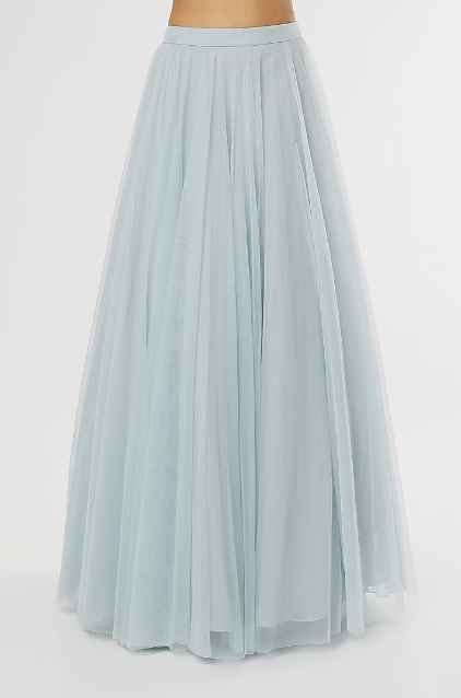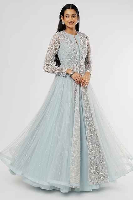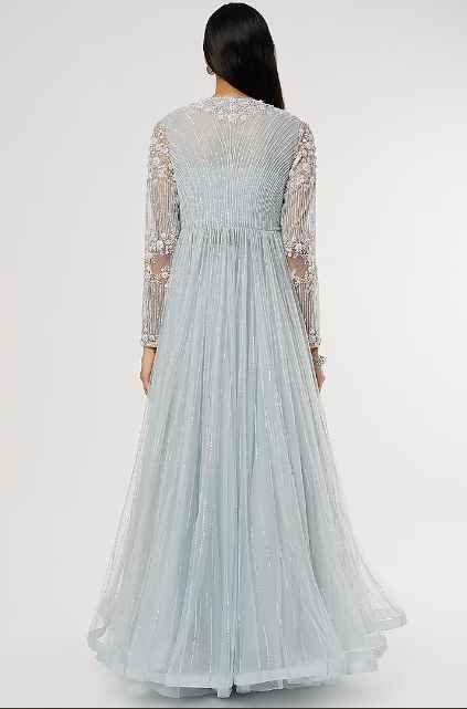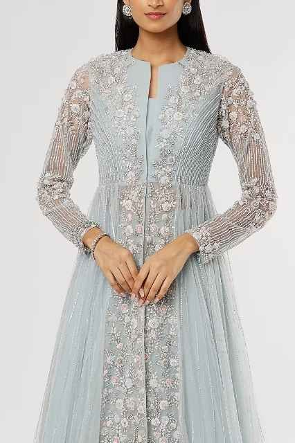 Featuring a sky blue jacket in taiwan net base with floral embroidery. It is paired with a matching skirt and a bustier.