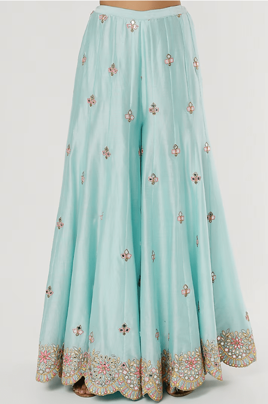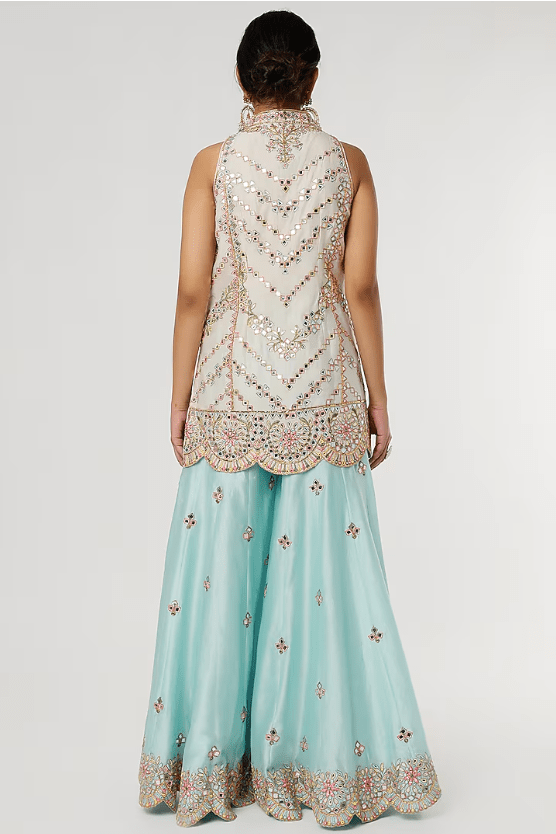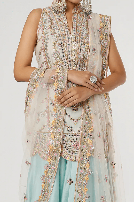 Featuring an ivory kurta in chanderi base with resham, mirror, foil and gota embroidery. It is paired with contrasting sky blue embroidered sharara pants and an organza dupatta.