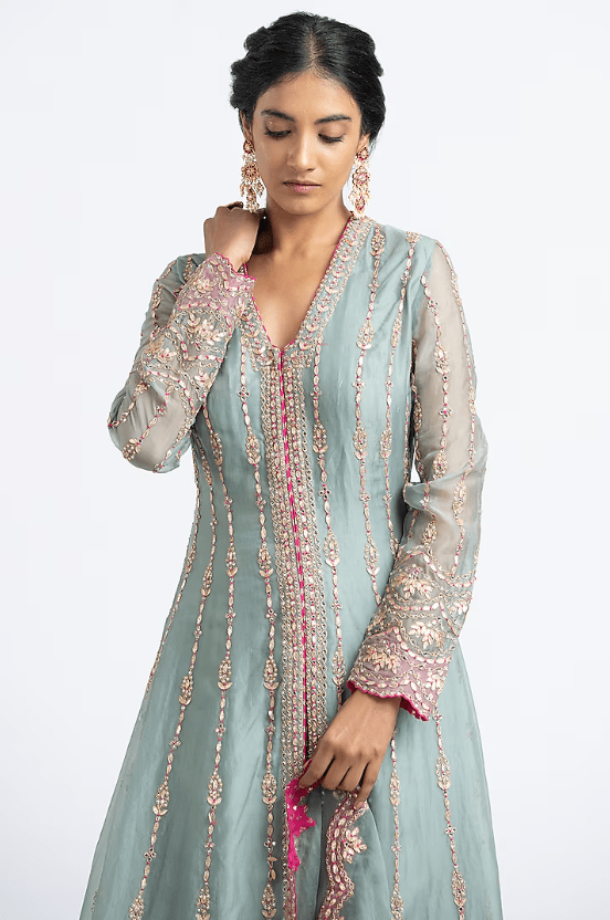 slate green jacket in organza base with gota embroidery. It is paired with a matching georgette sharara and a dupatta. Accentuate this jacket set with statement jewellery and heels for any festive occasion or mehendi ceremony.