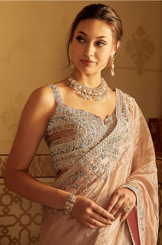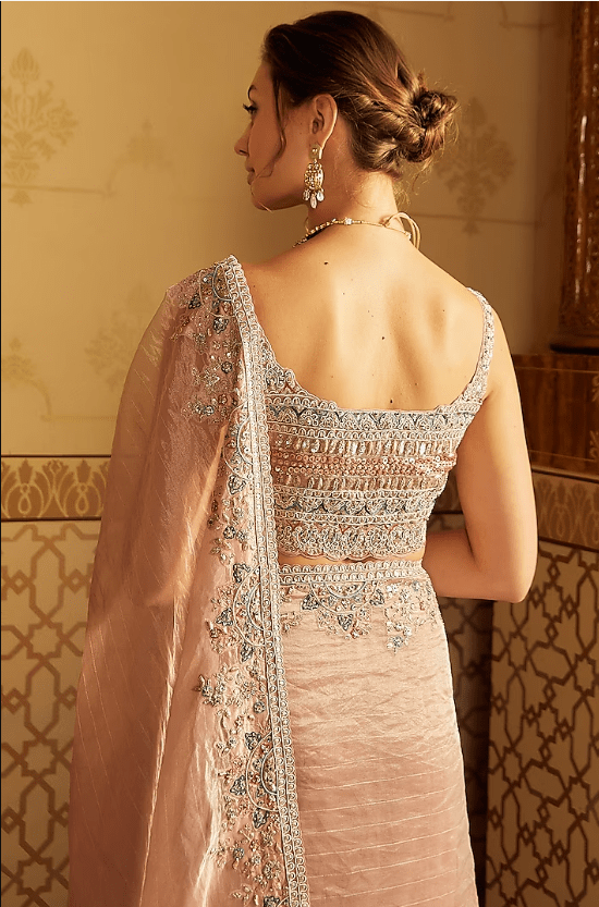 Featuring a soft berry saree in tissue base with hand embroidery. It is paired with a matching blouse.