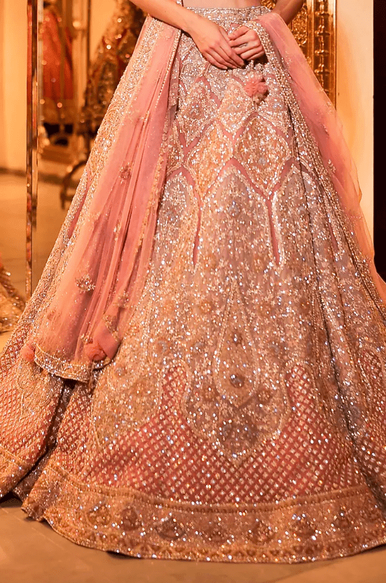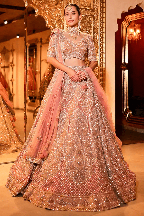 soft pink lehenga in net base with sequins, cutdana and aari embroidery. It is paired with an embroidered blouse and a dupatta. Style this designer lehenga set with statement kundan jewellery, potli bag and elegant block heels, Perfect for brides seeking an elevated and timeless bridal look.
