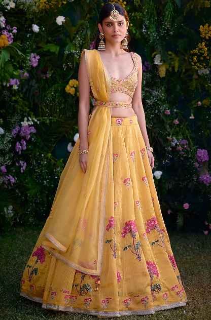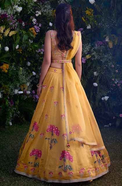 Spectra Yellow Lehenga Set that captivates with its elegance. The eye-catching lehenga is crafted in chanderi brocade with block print and zardosi embroidery. It is paired with a blouse, a belt and an organza dupatta. Accessorize the designer lehenga set with statement jewellery and heels for a wedding or haldi ceremony.