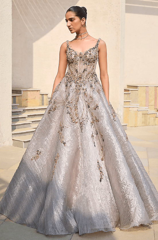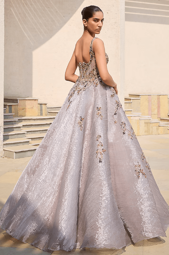 Featuring a steel grey gown in organza base with hand embroidery. Accentuate it with dangler earrings and heels for festive occasions, sangeet or wedding ceremonies