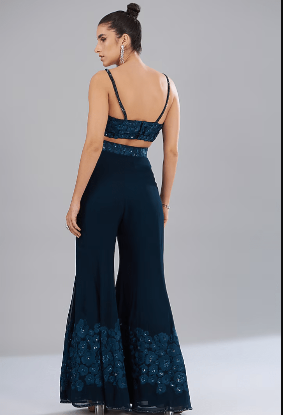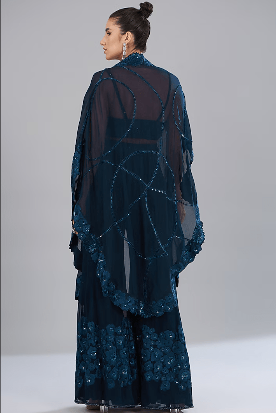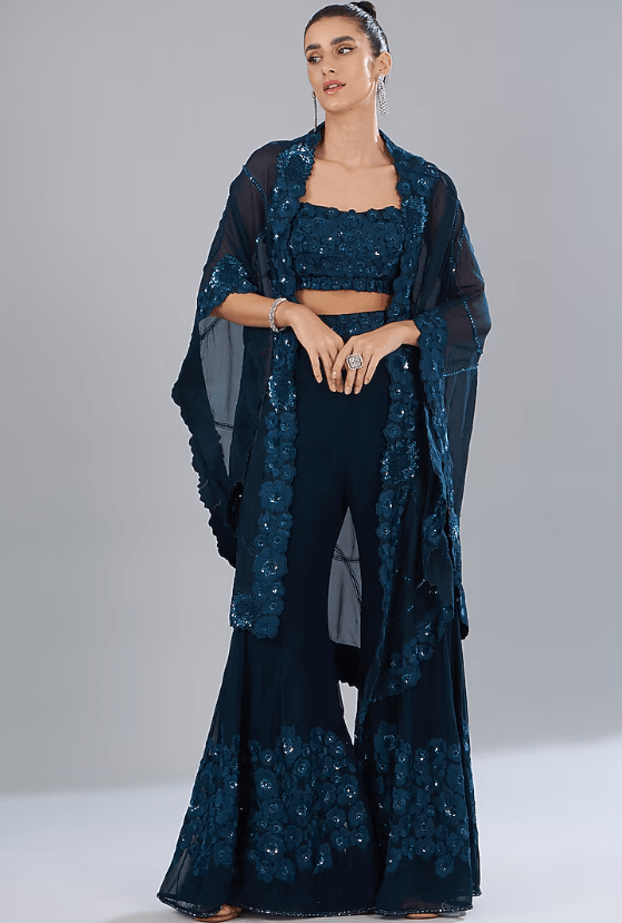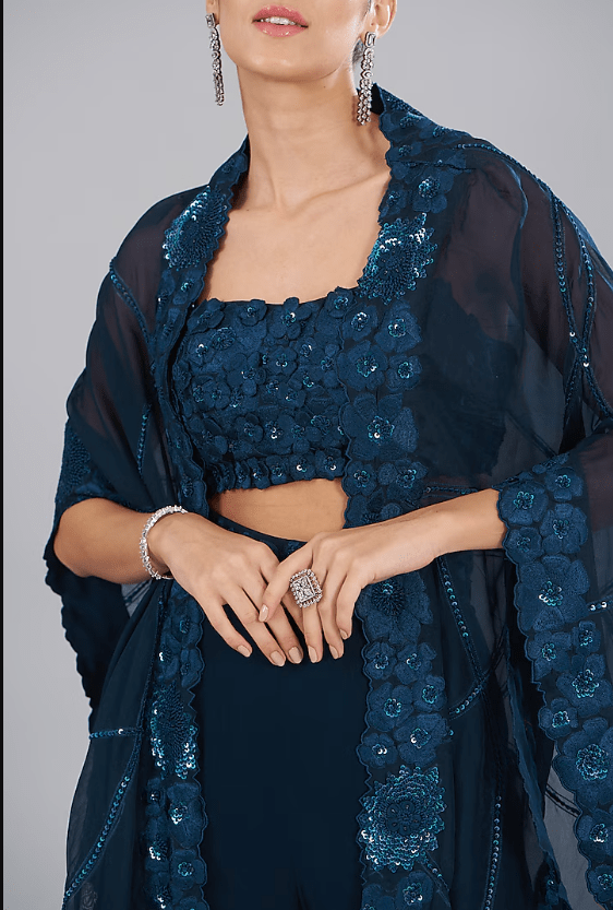 Featuring a blue triangle cape in organza and georgette base with floral hand and machine embroidery. It is paired with a matching blouse and pants.