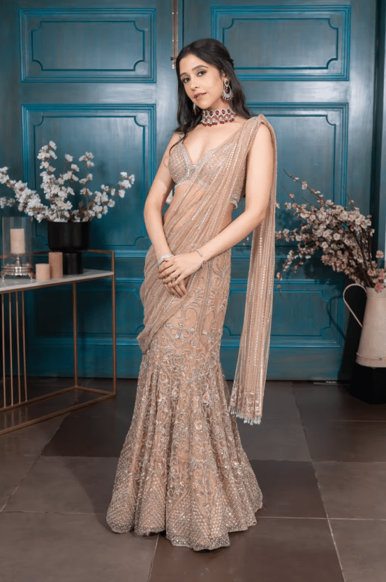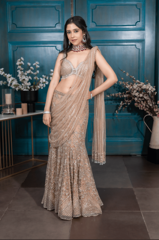 Pre-draped nude gold saree hand embroidered with sequin, cutdana and crystal detailing. Paired with a matching embroidered saree drape and strappy embellished blouse in net.