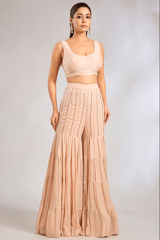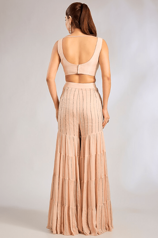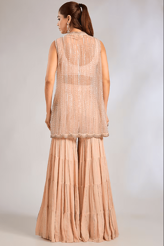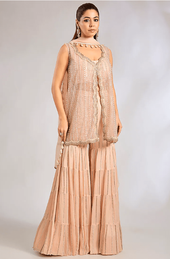 Featuring a taupe jacket in tulle base. It is paired with a silk dupion blouse, crushed chiffon sharara pants and a chiffon dupatta. Accentuate it with zircon jewellery and heels for a festive occasion, sangeet, wedding or sangeet ceremony.