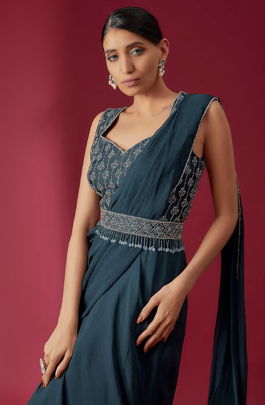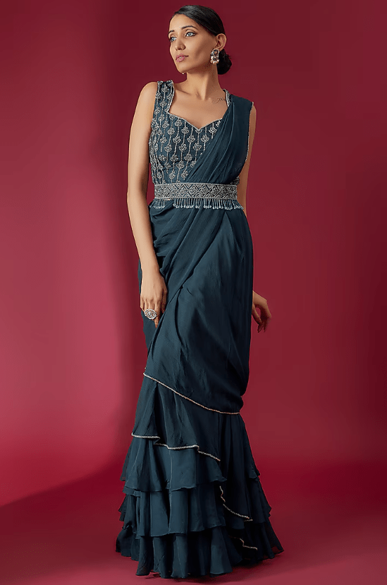 Featuring a teal blue ruffled saree in chiffon, organza and tussar base with hand embroidery. It is paired with a matching blouse and a belt. Accentuate it with statement earrings and heels for a sangeet or an engagement ceremony.
