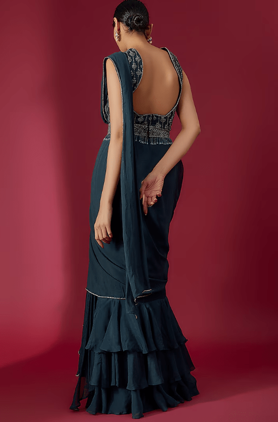 Teal Blue Chiffon & Organza Hand Embroidered Ruffled Saree Set