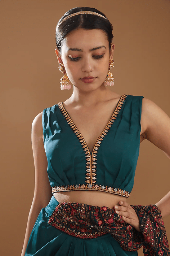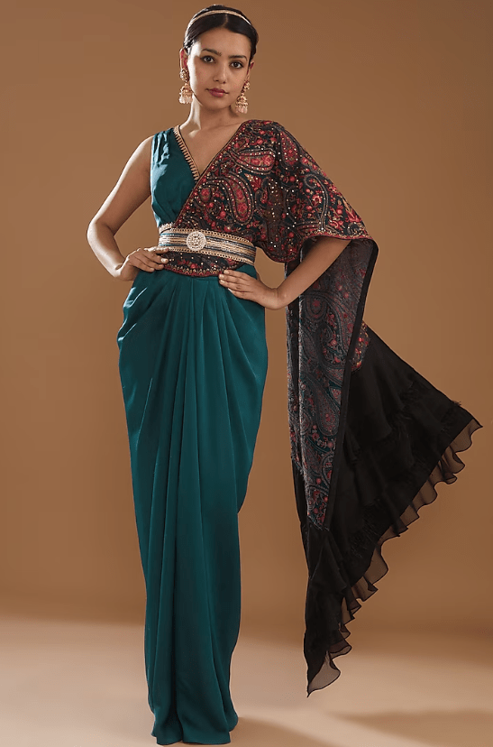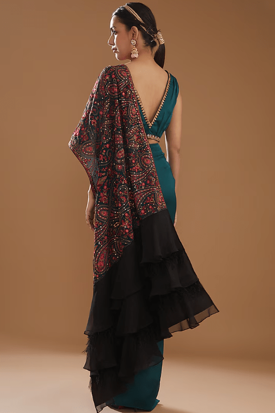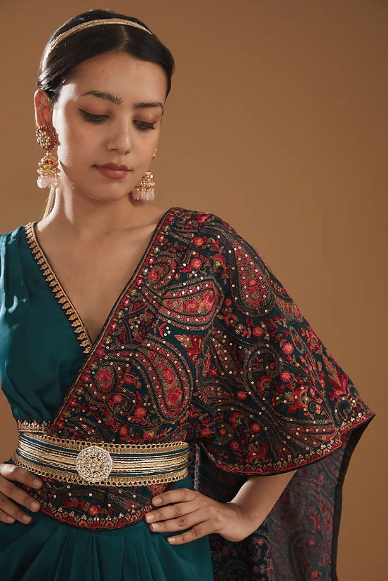 Featuring a teal blue draped saree in georgette and silk satin base with jamawaar and thread work. It is paired with a matching blouse and a belt.