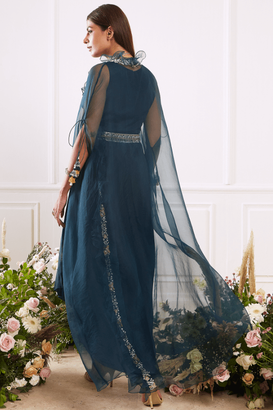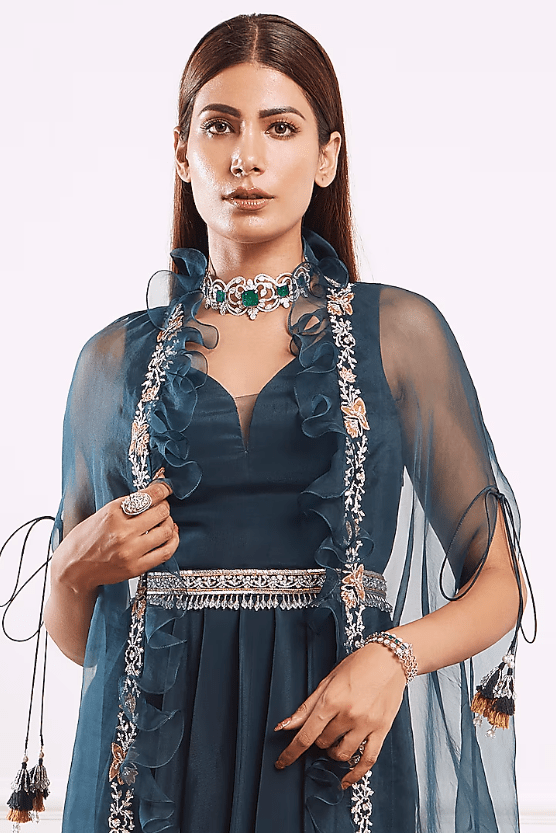 Featuring a teal green pleated dress in crepe base. It is paired with an organza ruffled cape jacket having glass beads, crystals and sequins hand embroidery, including a belt. Accentuate it with dangler earrings and heels for partywear.