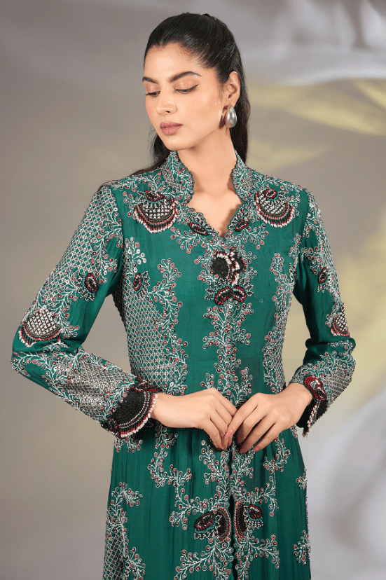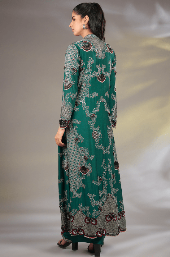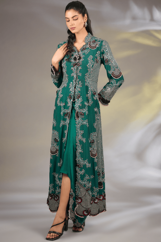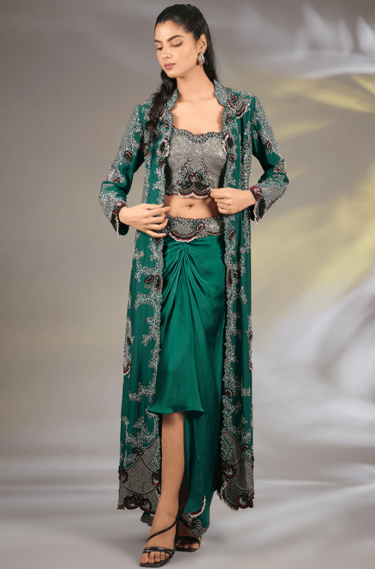 Featuring a teal green jacket in silk base with hand embroidery. It is paired with a black bustier and a satin pick-up skirt. Accentuate it with statement jewellery and heels for a festive occasion or sangeet ceremony.