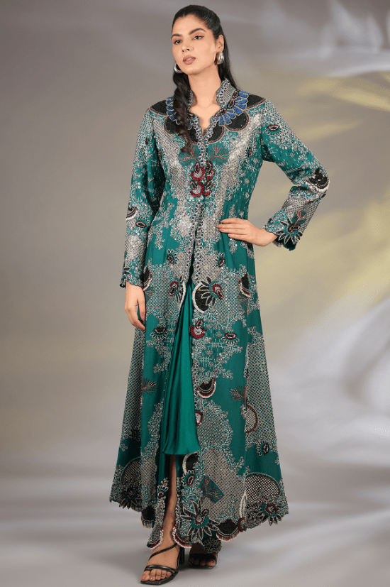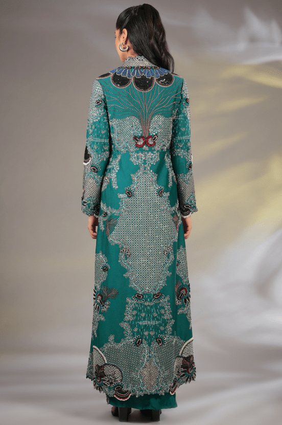 Featuring a teal green jacket in silk and crepe base with hand embroidery. It is paired with a satin pick-up skirt. Accentuate it with statement jewellery and heels for a festive occasion or sangeet ceremony.