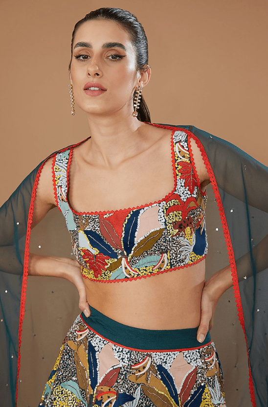 Featuring a teal lehenga in organza base with embroidery. It is paired with a blouse and a dupatta. Accessorize it with dangler earrings and block heels to accentuate your look. Perfect wear for a bridesmaid look.