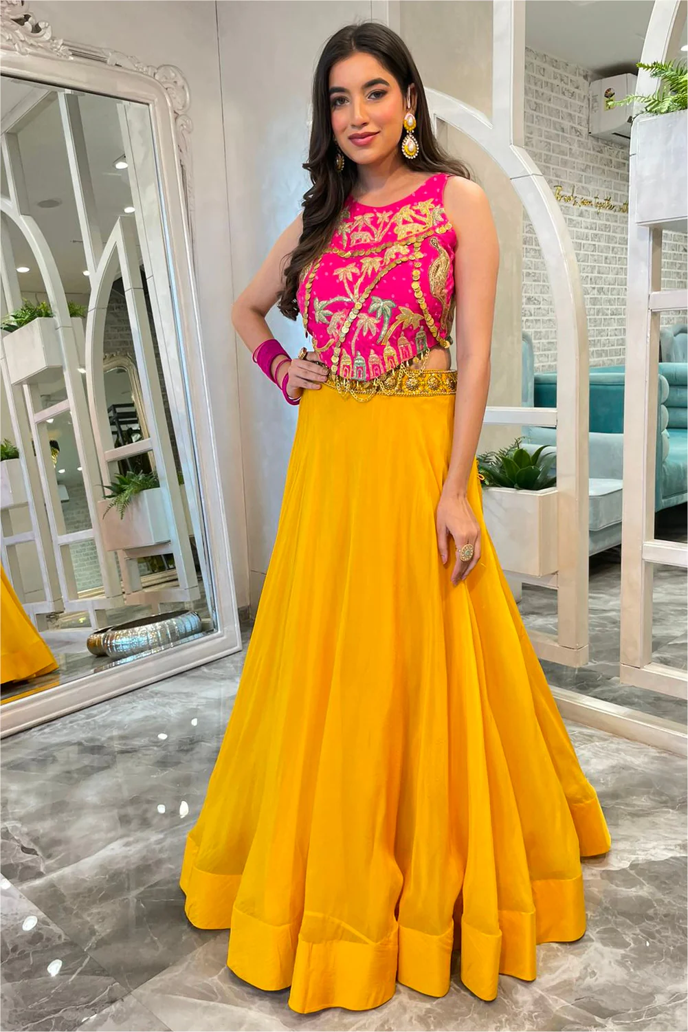 • It has a bias skirt with embellished belt.