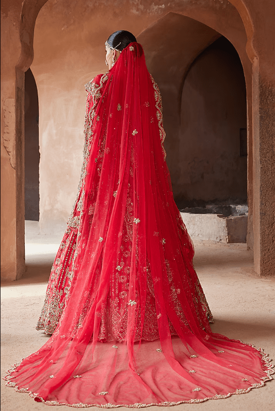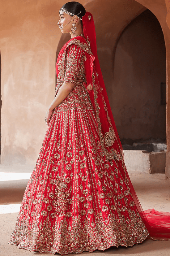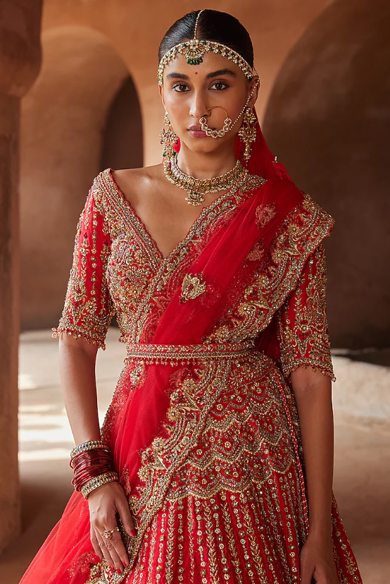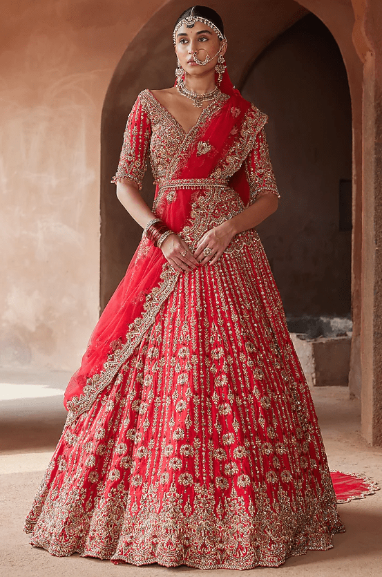 Featuring a vermillion red lehenga in raw silk base with gold zardosi, dabka, sequins, beads, and crystal embroidery. It is paired with a choli, a net dupatta, and a belt. Style the lehenga set with statement jewellery and a veil for a bridal look. Perfect wear for a wedding ceremony.
