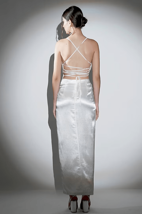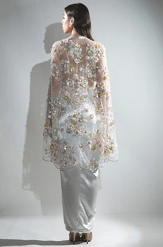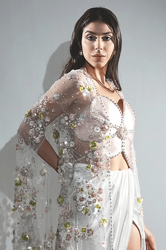 Featuring a white cape in cotton and polyester base with 3D floral, sequins and glass crystal hand embroidery. It is paired with a draped skirt and a crop top. Accentuate with statement jewellery and heels for cocktail parties or evening soirees.