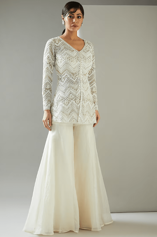 Featuring a white jacket in organza base with hand embroidery. It is paired with matching inner and sharara pants.