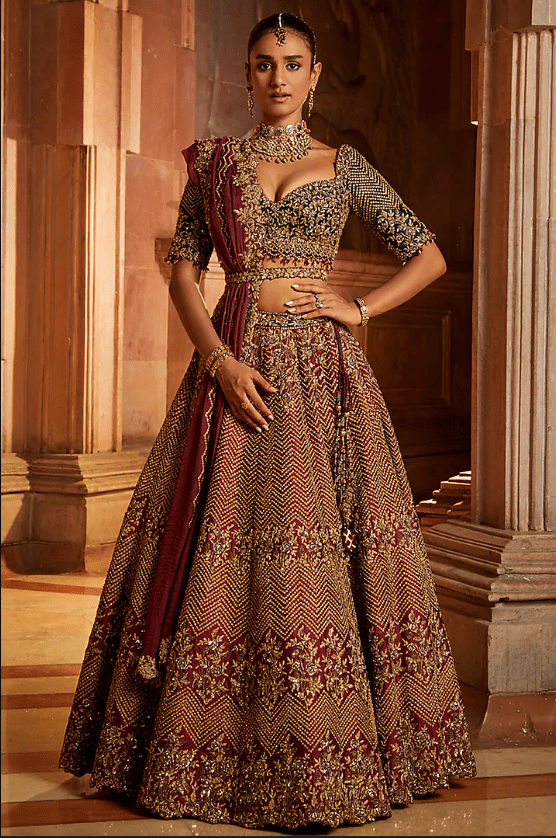 wine lehenga in taffeta base with gold zari, dabka, sequins, and crystals embroidery. It is paired with a contrasting navy blue blouse, a tissue dupatta, and a belt. Accentuate this lehenga set with polki jewellery and heels for a perfect bridal look.