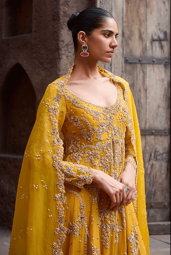 Featuring a yellow kamdani kurta in chiffon base. It is paired with a skirt and an organza dupatta. Accentuate it with dangler earrings and heels for festive occasions, haldi or wedding ceremonies.