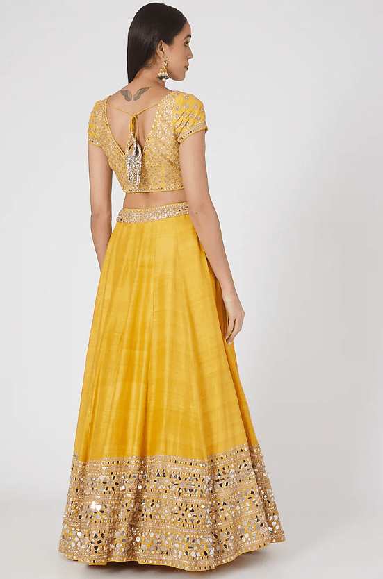 Featuring a yellow blouse in raw silk and organza base with embellishments. It is paired with a matching lehenga and a blue dupatta.
