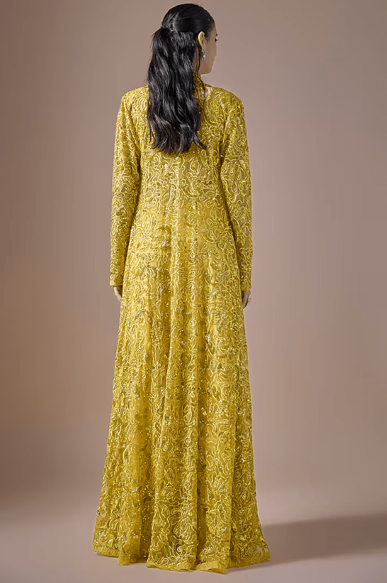 Featuring a yellow jacket in satin and tulle base with beads embroidery. It is paired with an embroidered blouse and sharara pants. Accentuate it with zircon jewellery, embellished heels, a sleek bun and a potli bag for a sangeet look, haldi or cocktail soirees.