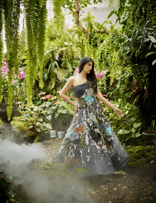 The Zohra Gown in grey, crafted from organza and crepe, features an off-shoulder design with intricate 3D floral appliqu?? work. The gownƒ??s multi-dimensional embellishments add texture and depth, while the structured bodice and flowing skirt create an elegant, sophisticated silhouette. Ideal for special occasions.