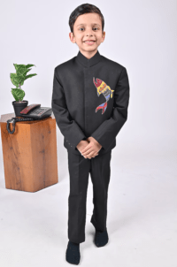 Black Viscose Blend Hand Embroidered Coat Set For Boys