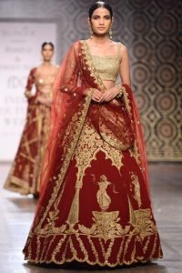 Marsala and gold kasab work dancing figures lehenga set