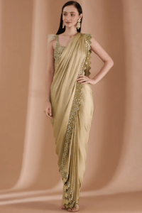 Beige Shimmer Crepe Geometric Hand Embellished Draped Saree Set