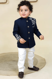 Navy Blue Embroidered Bandhgala Jacket Set For Boys