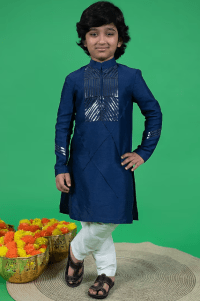 Navy Blue Cotton Silk Embroidered Kurta Set For Boys
