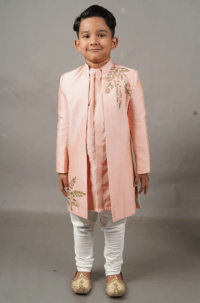 Pink Cotton Silk Leaf Hand Embroidered Front Open Sherwani Set For Boys