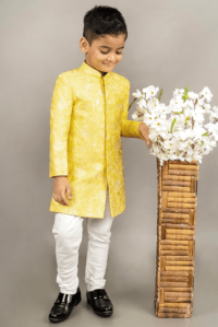 Yellow Cotton Silk Floral Embroidered Sherwani Set For Boys